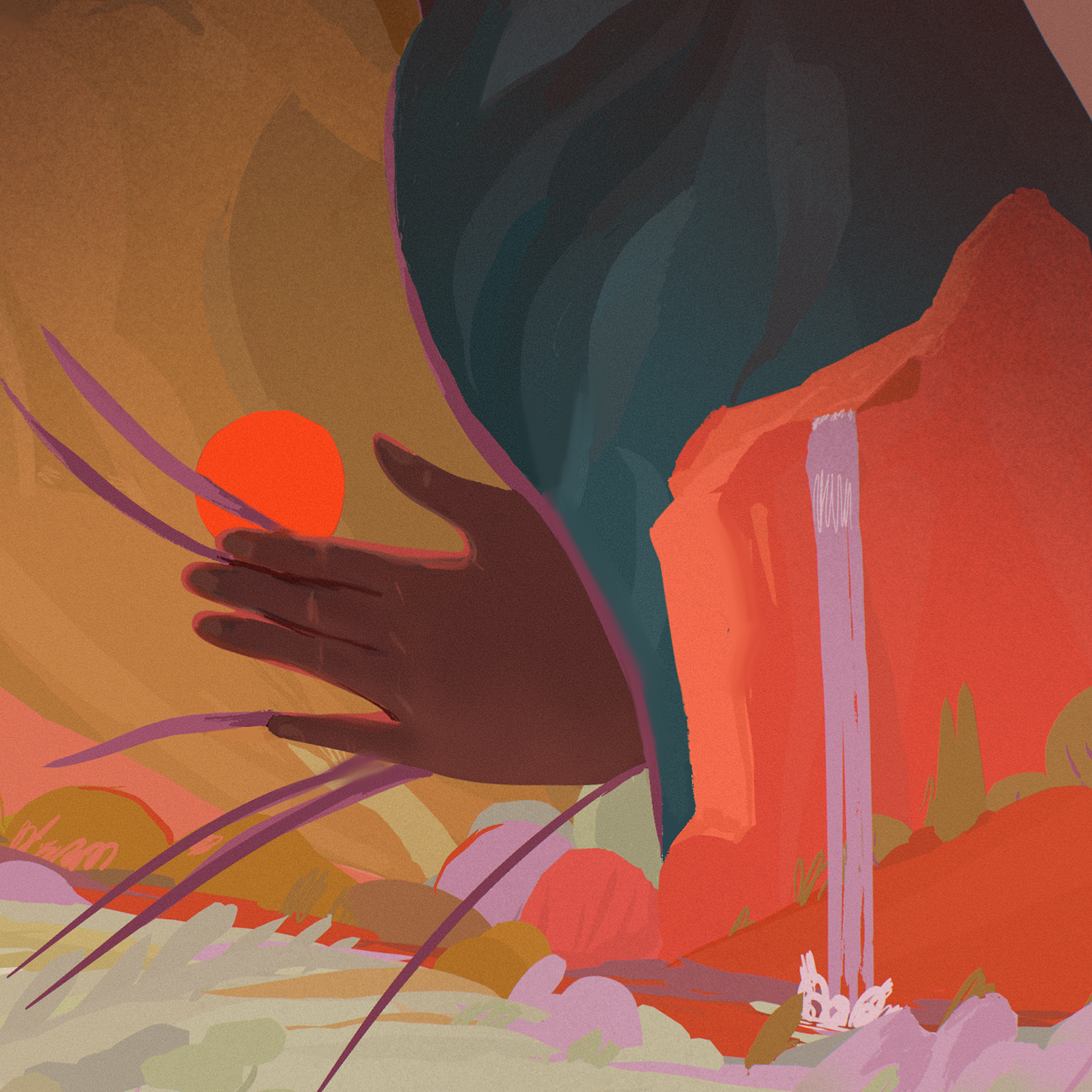 My process involved trying out different prompts until I liked what it gave me. This image was about my 20th prompt. I had this idea already, of a landscape inside of a woman’s blanket. It was interesting to me how the curves of the land were echoed in the curves of her body. I also liked the mystery of the shadowy face.